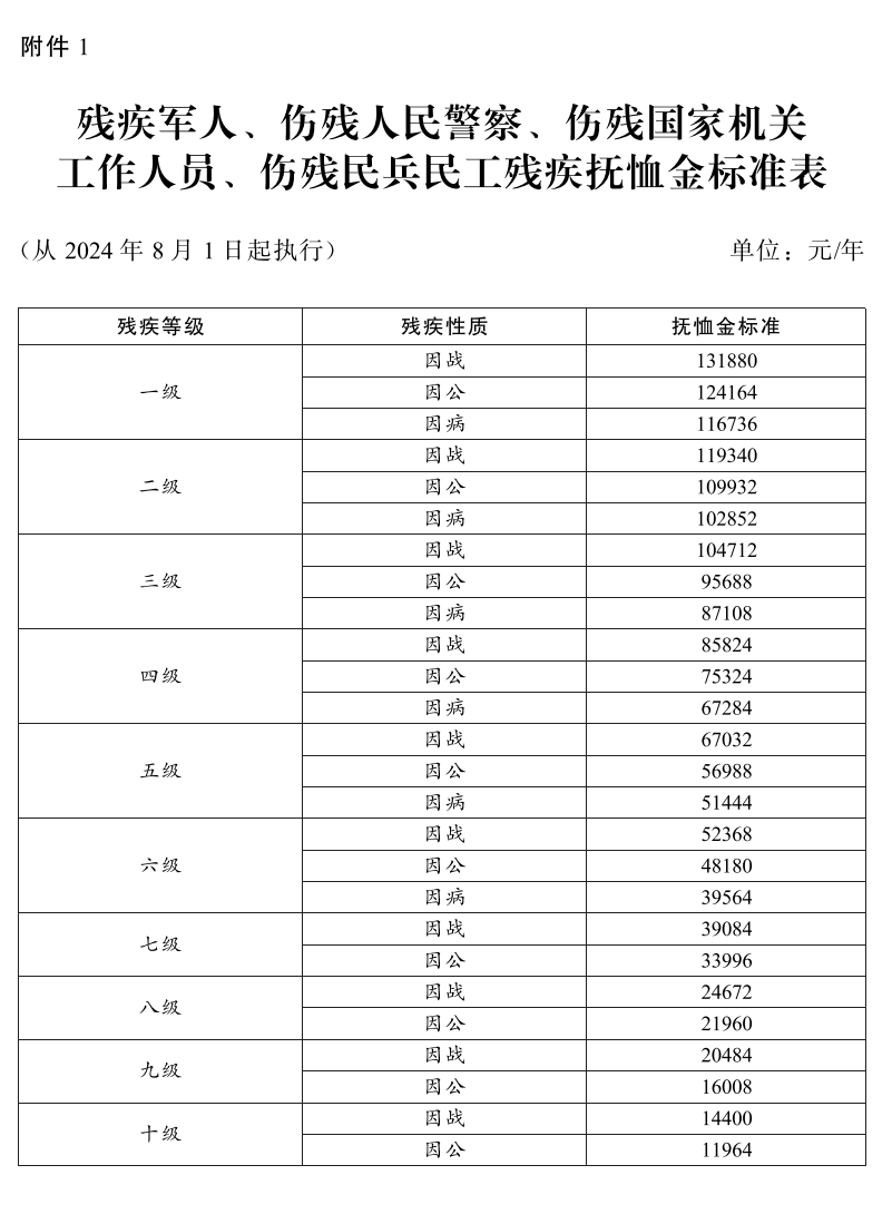 附件:1.残疾军人、伤残人民警察、伤残国家机关工作人员、伤残民兵民工残疾抚恤金标准表