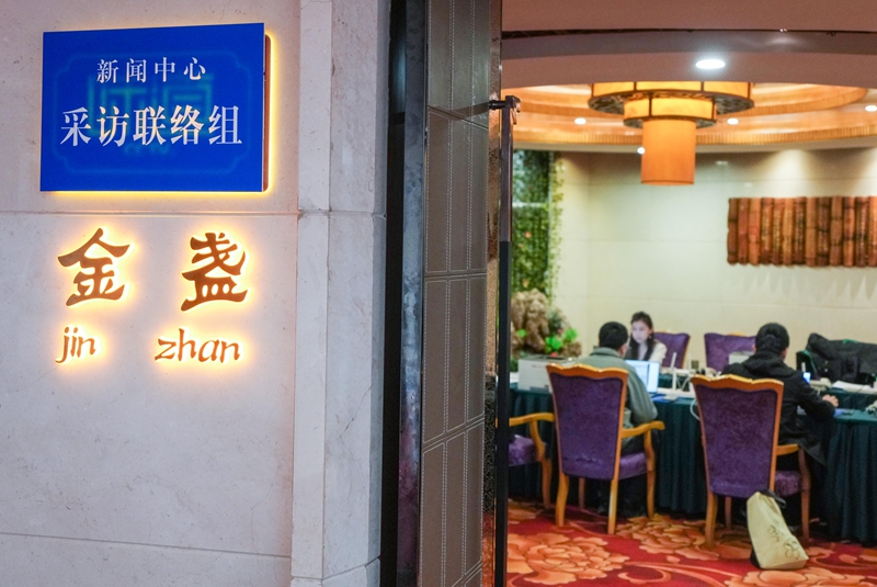 2月27日,工作人员在全国两会新闻中心采访联络组工作。