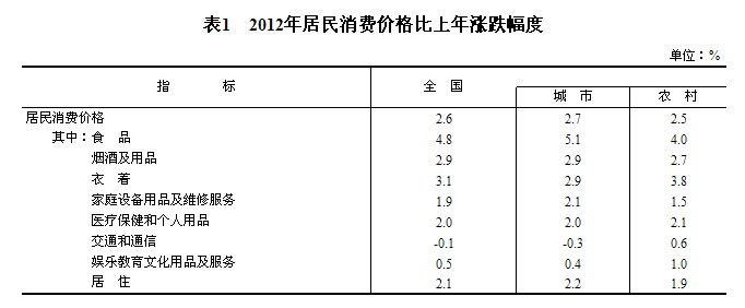全年居民消费价格比上年上涨2.6%,其中食品价格上涨4.8%。固定资产投资价格上涨1.1%。工业生产者出厂价格下降1.7%。工业生产者购进价格下降1.8%。农产品生产者价格[3]上涨2.7%。