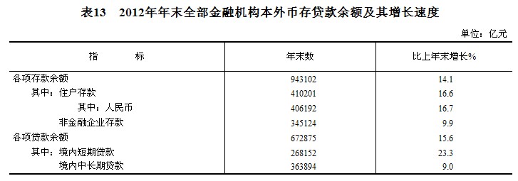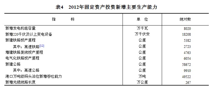 资料来源:本公报中城镇新增就业、登记失业率、社会保障数据来自人力资源社会保障部;外汇储备和汇率数据来自外汇局;财政数据来自财政部;水产品产量数据来自农业部;木材产量、林业、森林火灾数据来自林业局;灌溉面积、水资源数据来自水利部;新增发电机组容量、新增220千伏及以上变电设备数据来自中电联;新建铁路投产里程、增建铁路复线投产里程、电气化铁路投产里程、铁路运输数据来自铁道部;新建公路、港口万吨级码头泊位新增吞吐能力、公路运输、水运、港口货物吞吐量数据来自交通运输部;新增光缆线路长度、新增移动电话交换机容量、电话用户、上网人数等通信数据来自工业和信息化部;保障性住房、城市污水处理、城市集中供热面积、建成区绿地率数据来自住房城乡建设部;货物进出口数据来自海关总署;外商直接投资、对外直接投资、对外承包工程、对外劳务合作等数据来自商务部;民航数据来自民航局;管道数据来自中石油、中石化;民用汽车、交通事故数据来自公安部;邮政业务数据来自邮政局;旅游数据来自旅游局、公安部;货币金融、公司信用类债券数据来自人民银行;上市公司数据来自证监会;保险业数据来自保监会;教育数据来自教育部;安排科技计划课题、技术合同等数据来自科技部;国家工程研究中心、企业技术中心、新兴产业创投等数据来自发展改革委;专利数据来自知识产权局;发射卫星数据来自国防科工局;质量检验、国家标准制定修订数据来自质检总局;气象预警、平均气温、登陆台风数据来自气象局;地震数据来自地震局;测绘数据来自测绘局;海洋观测站、海洋灾害造成直接经济损失数据来自海洋局;艺术表演团体、博物馆、公共图书馆、文化馆数据来自文化部;广播电视、电影数据来自广电总局;报纸、期刊、图书数据来自新闻出版总署;档案数据来自档案局;体育数据来自体育总局;残奥会数据来自中国残联;卫生、新农合数据来自卫生部;社会服务、低保和五保供养数据、农作物受灾面积、洪涝地质灾害造成直接经济损失、旱灾造成直接经济损失、低温冷冻和雪灾造成直接经济损失来自民政部;国有建设用地供应数据来自国土资源部;自然保护区、环境监测数据来自环境保护部;安全生产数据来自安全监管总局;其他数据均来自国家统计局。
