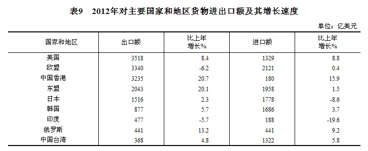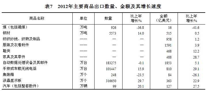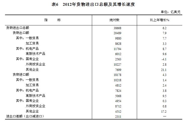 全年货物进出口总额38668亿美元,比上年增长6.2%。其中,出口20489亿美元,增长7.9%;进口18178亿美元,增长4.3%。进出口差额(出口减进口)2311亿美元,比上年增加762亿美元。