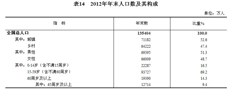 年末全国大陆总人口为135404万人,比上年末增加669万人,其中城镇人口为71182万人,占总人口比重为52.6%,比上年末提高1.3个百分点。全年出生人口1635万人,出生率为12.10‰;死亡人口966万人,死亡率为7.15‰;自然增长率为4.95‰。出生人口性别比为117.70。0-14岁(含不满15周岁)人口22287万人,占总人口的16.5%,比上年末提高0.01个百分点;15-59岁(含不满60周岁)劳动年龄人口93727万人,比上年末减少345万人,占总人口的69.2%,比上年末下降0.60个百分点;60周岁及以上人口19390万人,占总人口的14.3%,比上年末提高0.59个百分点。全国人户分离的人口[25]为2.79亿人,其中流动人口[26]为2.36亿人。
