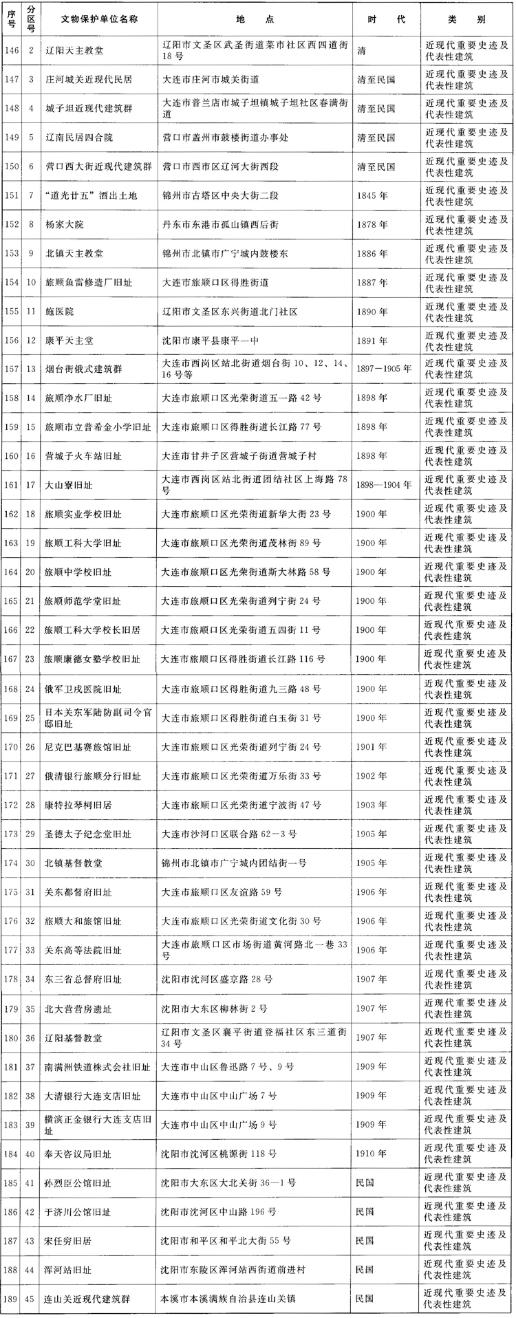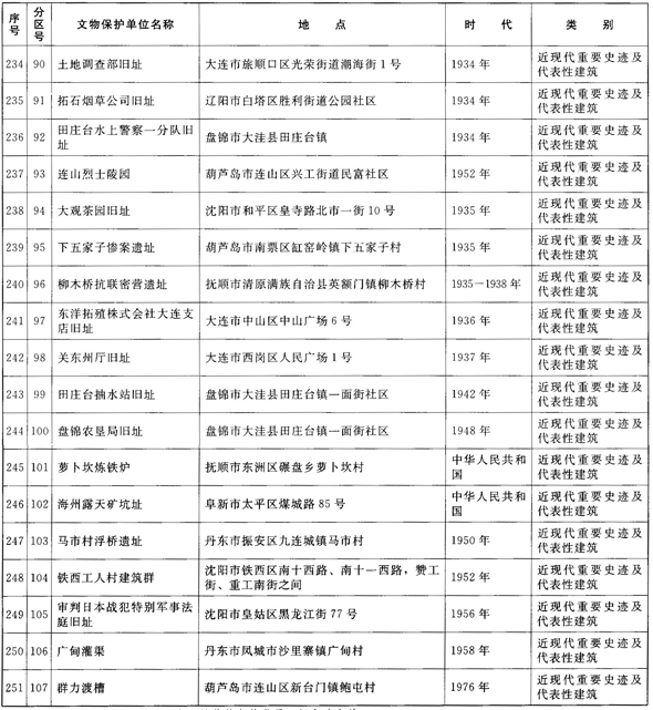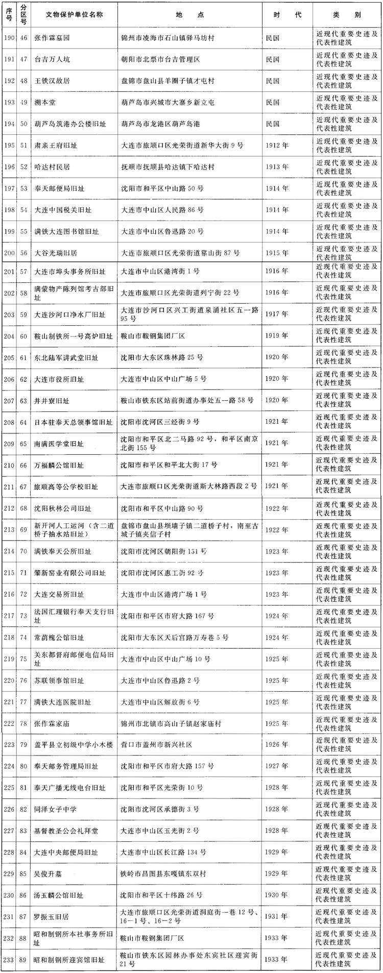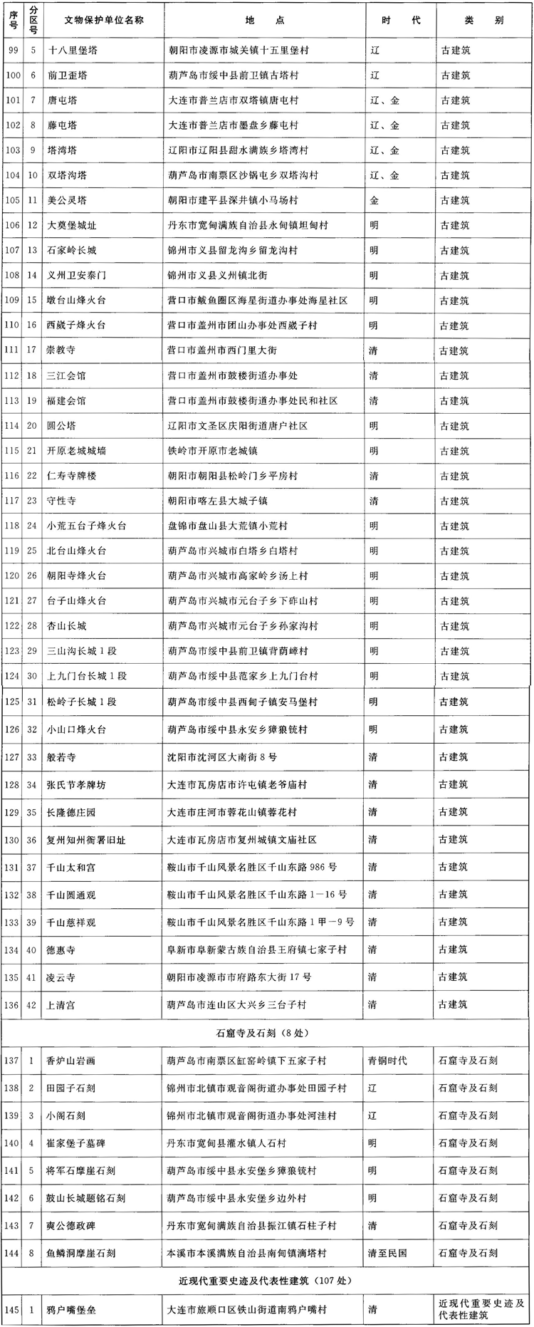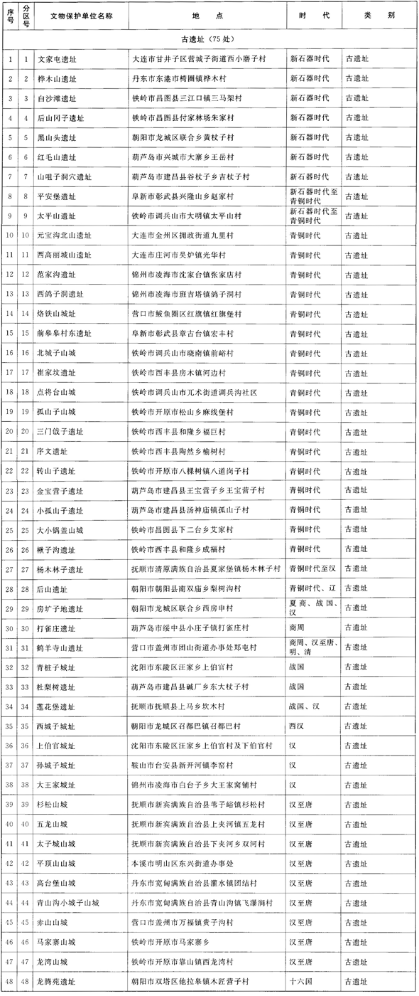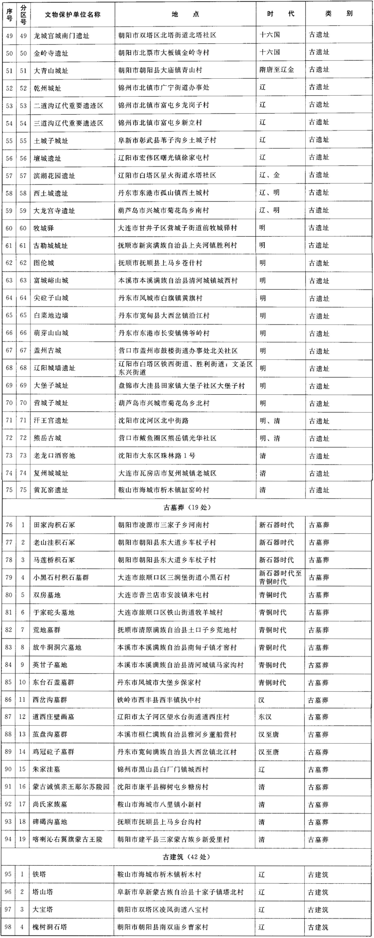 各市人民政府,省政府各厅委、各直属机构: 根据《中华人民共和国文物保护法》的规定,现将辽宁省第九批省级文物保护单位予以公布。 各市政府要贯彻落实“保护为主,抢救第一,合理利用,加强管理”的文物工作方针,严格按照文物保护单位“四有”(有保护范围、有标志说明、有记录档案、有专门机构或者专人负责管理)的工作要求,认真做好新公布的省级文物保护单位的保护管理工作。 附件:辽宁省第九批省级文物保护单位名单