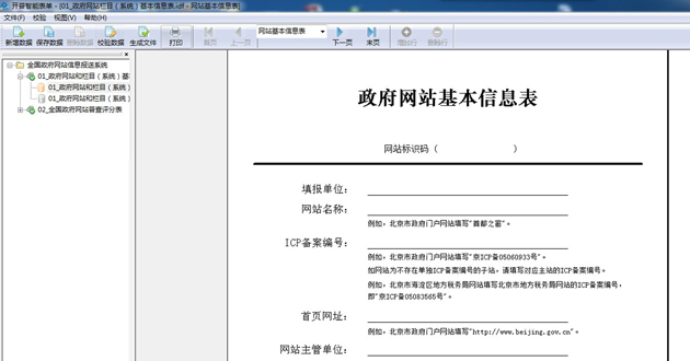 填报单位运行客户端软件,打开“政府网站和栏目(系统)基本信息表”并新建数据,填写政府网站和栏目(系统)基本信息并保存。表单所有信息项均为必填项,如确无内容请填写“无”。