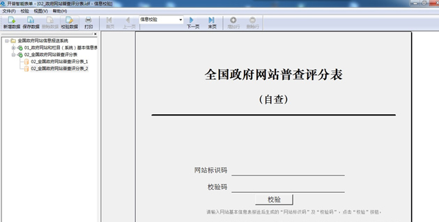 填报单位打开客户端软件,选取“全国政府网站普查评分表”并新建数据,首先输入“网站标识码”和“校验码”,通过验证后,填写该网站的自查评分信息并保存。