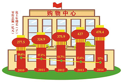 全年社会消费品零售总额478.4亿元,比上年增长12%。分城乡看,城镇零售额410.6亿元,增长11.9%;乡村零售额67.8亿元,增长12.6%。分消费形态看,商品零售额423.7亿元,增长12.3%;餐饮收入额54.7亿元,增长10%。分规模看,限额以上零售额137亿元,增长4.1%;限额以下零售额341.4亿元,增长15.6%。