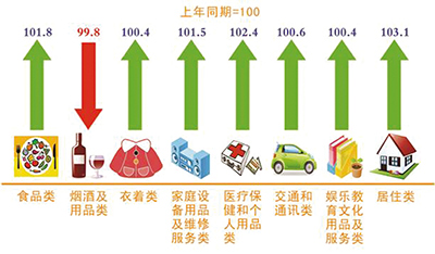全年居民消费价格指数(CPI)比上年上涨1.6%。八大类商品呈七涨一降态势。分类别看,居住类价格上涨幅度最大,比上年上涨3.1%;医疗保健和个人用品类上涨居第二位,比上年上涨2.4%;食品类、衣着类、家庭设备用品及维修服务类、交通和通讯类、娱乐教育文化用品及服务类分别上涨1.8%、0.4%、1.5%、0.6%和0.4%;唯一下降的类别为烟酒及用品类,比上年下降0.2%。