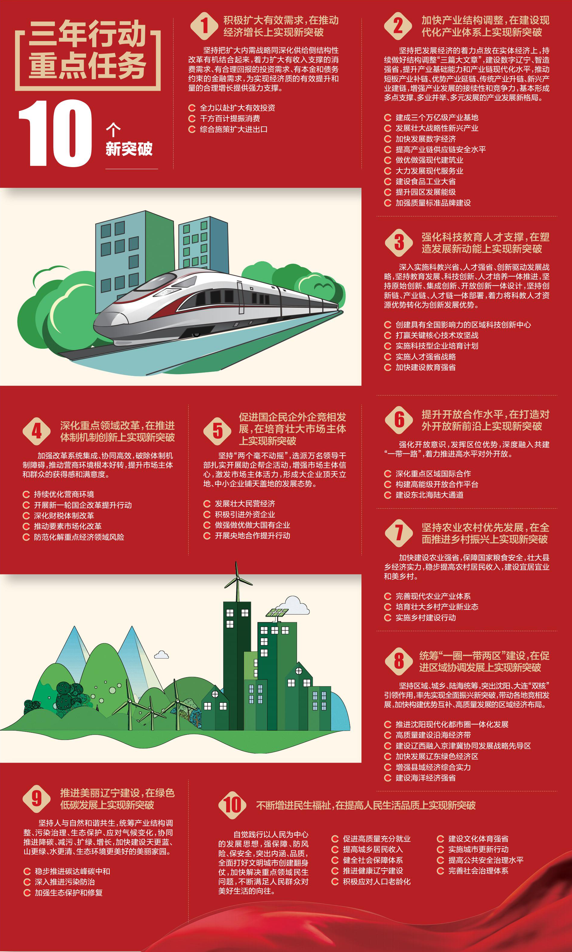 通过三年努力,维护国家“五大安全”能力显著提升,高质量发展迈上新台阶,结构调整步伐加快,创新能力显著增强,数字辽宁、智造强省建设成效明显,改革开放取得重大进展,营商环境实现根本好转,“一圈一带两区”建设加快推进,生态环境建设取得扎实成效,社会治理能力不断增强,人民生活品质持续改善,形成营商环境好、创新能力强、区域格局优、生态环境美、开放活力足、幸福指数高的振兴发展新局面,以中国式现代化辽宁实践推动全面振兴取得新突破。