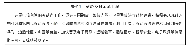 大力推进高速光纤网络建设。开展智能网络新技术规模应用试点,推动国家骨干网向高速传送、灵活调度、智能适配方向升级。全面实现向全光网络跨越,加快推进城镇地区光网覆盖,提供每秒1000兆比特(1000Mbps)以上接入服务,大中城市家庭用户实现带宽100Mbps以上灵活选择;多方协同推动提升农村光纤宽带覆盖率,98%以上的行政村实现光纤通达,有条件的地区提供100Mbps以上接入服务,半数以上农村家庭用户实现带宽50Mbps以上灵活选择。推动三网融合基础设施发展。推进互联网协议第六版(IPv6)演进升级和应用,推动骨干企业新增网络地址不再使用私有地址。