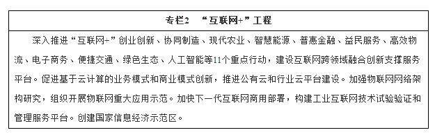 (二)推进“互联网+”行动。促进新一代信息技术与经济社会各领域融合发展,培育“互联网+”生态体系。