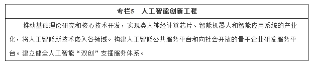 (五)发展人工智能。培育人工智能产业生态,促进人工智能在经济社会重点领域推广应用,打造国际领先的技术体系。