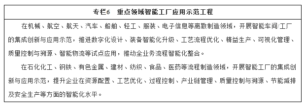 大力发展智能制造系统。加快推动新一代信息技术与制造技术的深度融合,开展集计算、通信与控制于一体的信息物理系统(CPS)顶层设计,探索构建贯穿生产制造全过程和产品全生命周期,具有信息深度自感知、智慧优化自决策、精准控制自执行等特征的智能制造系统,推动具有自主知识产权的机器人自动化生产线、数字化车间、智能工厂建设,提供重点行业整体解决方案,推进传统制造业智能化改造。建设测试验证平台,完善智能制造标准体系。