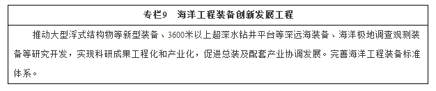 (五)增强海洋工程装备国际竞争力。推动海洋工程装备向深远海、极地海域发展和多元化发展,实现主力装备结构升级,突破重点新型装备,提升设计能力和配套系统水平,形成覆盖科研开发、总装建造、设备供应、技术服务的完整产业体系。