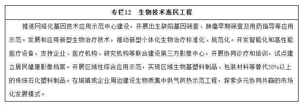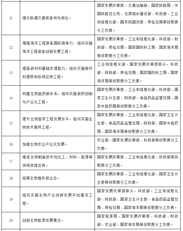 把握生命科学纵深发展、生物新技术广泛应用和融合创新的新趋势,以基因技术快速发展为契机,推动医疗向精准医疗和个性化医疗发展,加快农业育种向高效精准育种升级转化,拓展海洋生物资源新领域、促进生物工艺和产品在更广泛领域替代应用,以新的发展模式助力生物能源大规模应用,培育高品质专业化生物服务新业态,将生物经济加速打造成为继信息经济后的重要新经济形态,为健康中国、美丽中国建设提供新支撑。到2020年,生物产业规模达到8—10万亿元,形成一批具有较强国际竞争力的新型生物技术企业和生物经济集群。