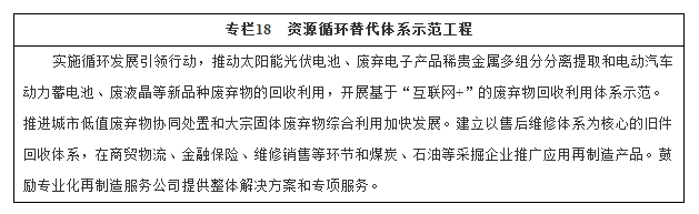 (五)深入推进资源循环利用。树立节约集约循环利用的资源观,大力推动共伴生矿和尾矿综合利用、“城市矿产”开发、农林废弃物回收利用和新品种废弃物回收利用,发展再制造产业,完善资源循环利用基础设施,提高政策保障水平,推动资源循环利用产业发展壮大。到2020年,力争当年替代原生资源13亿吨,资源循环利用产业产值规模达到3万亿元。