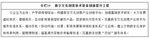 增强传播服务技术装备水平。研发具有自主知识产权的超感影院、混合现实娱乐、广播影视融合媒体制播等配套装备和平台,开拓消费新领域。大力研发数字艺术呈现技术,提升艺术展演展陈数字化、智能化、网络化应用水平,支持文物保护装备产业化及应用。研究制定数字文化创意技术装备关键标准,推动自主标准国际化,完善数字文化创意技术装备和相关服务的质量管理体系。
