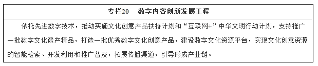 以数字技术和先进理念推动文化创意与创新设计等产业加快发展,促进文化科技深度融合、相关产业相互渗透。到2020年,形成文化引领、技术先进、链条完整的数字创意产业发展格局,相关行业产值规模达到8万亿元。