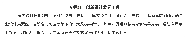 强化工业设计引领作用。积极发展第三方设计服务,支持设计成果转化。鼓励企业加大工业设计投入,推动工业设计与企业战略、品牌深度融合,促进创新设计在产品设计、系统设计、工艺流程设计、商业模式和服务设计中的应用。支持企业通过创新设计提升传统工艺装备,推进工艺装备由单机向互联、机械化向自动化持续升级。以创意和设计引领商贸流通业创新,加强广告服务,健全品牌价值体系。制定推广行业标准,推动产业转型升级。支持建设工业设计公共服务平台。通过工业设计推动中国制造向中国创造、中国速度向中国质量转变。