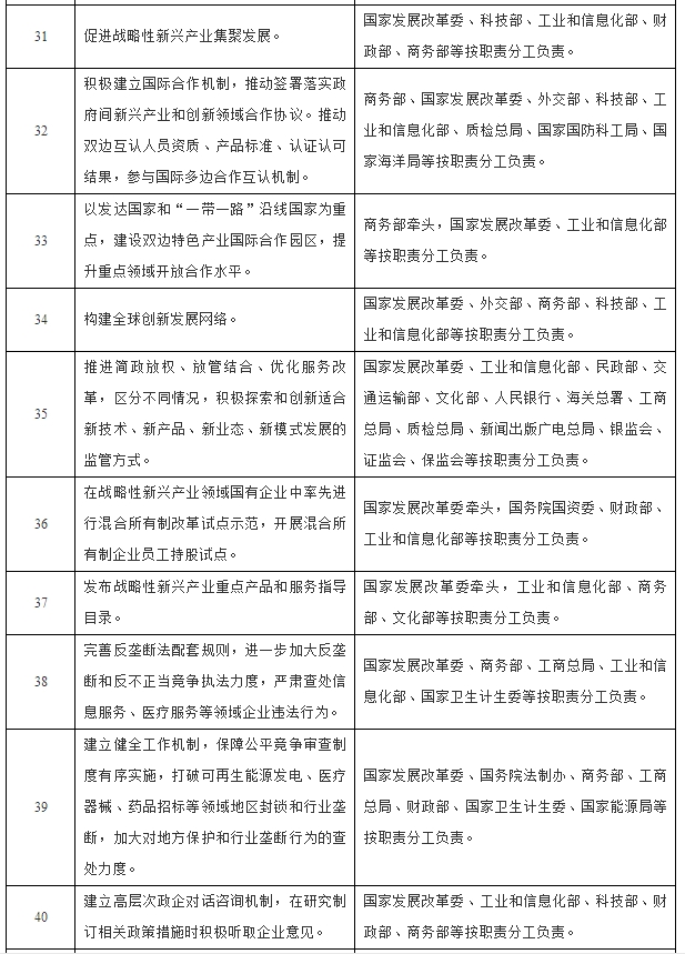 推进简政放权、放管结合、优化服务改革。在电信、新药和医疗器械、新能源汽车生产准入等领域,进一步完善审批方式,最大限度减少事前准入限制,修改和废止有碍发展的行政法规和规范性文件,激发市场主体活力。坚持放管结合,区分不同情况,积极探索和创新适合新技术、新产品、新业态、新模式发展的监管方式,既激发创新创造活力,又防范可能引发的风险。对发展前景和潜在风险看得准的“互联网+”、分享经济等新业态,量身定制监管模式;对看不准的领域,加强监测分析,鼓励包容发展,避免管得过严过死;对潜在风险大、有可能造成严重不良社会后果的,切实加强监管;对以创新之名行非法经营之实的,坚决予以取缔。严格执行降低实体经济企业成本各项政策措施,落实中央财政科研项目资金管理相关政策措施,推进科技成果产权制度改革。全面落实深化国有企业改革各项部署,在战略性新兴产业领域国有企业中率先进行混合所有制改革试点示范,开展混合所有制企业员工持股试点。发布战略性新兴产业重点产品和服务指导目录。