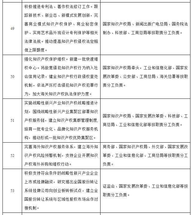 完善知识产权发展机制。实施战略性新兴产业知识产权战略推进计划,围绕战略性新兴产业集聚区部署知识产权服务链,建立知识产权集群管理制度,推动形成一批知识产权优势集聚区。加强战略性新兴产业专利分析及动向监测。建立重大经济科技活动知识产权分析评议制度,鼓励企业建立知识产权分析评议机制。完善海外知识产权服务体系,研究发布海外知识产权环境信息,跟踪研究重点产业领域国际知识产权动向,引导建立海外知识产权案件信息提交机制,加强对重大知识产权案件的研究,建立海外知识产权风险预警机制,支持企业开展知识产权海外并购和维权行动。