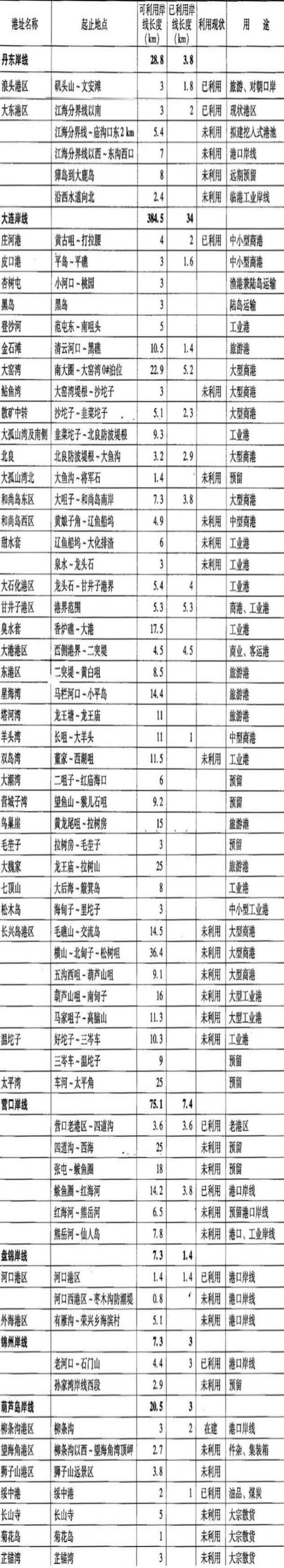 改革开放以来,随着港口的较快发展,沿海宜港岸线得到了大规模的开发利用,相继新建了大连港大窑湾港区、营口鲅鱼圈港区、丹东港大东港区、锦州港、旅顺新港和绥中港,葫芦岛港柳条沟港区正在建设中,占用了大量的深水岸线。同时,沿海的盘锦港、庄河港、皮口港、长山群岛及沿海的主要岛屿还建设了大量的中小型泊位,占用的一般为浅水岸线。目前,全省沿海已利用的港口岸线51.1公里,占全省大陆海岸线总长的2.2%。