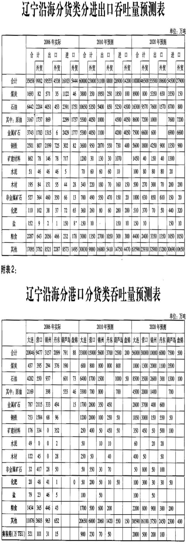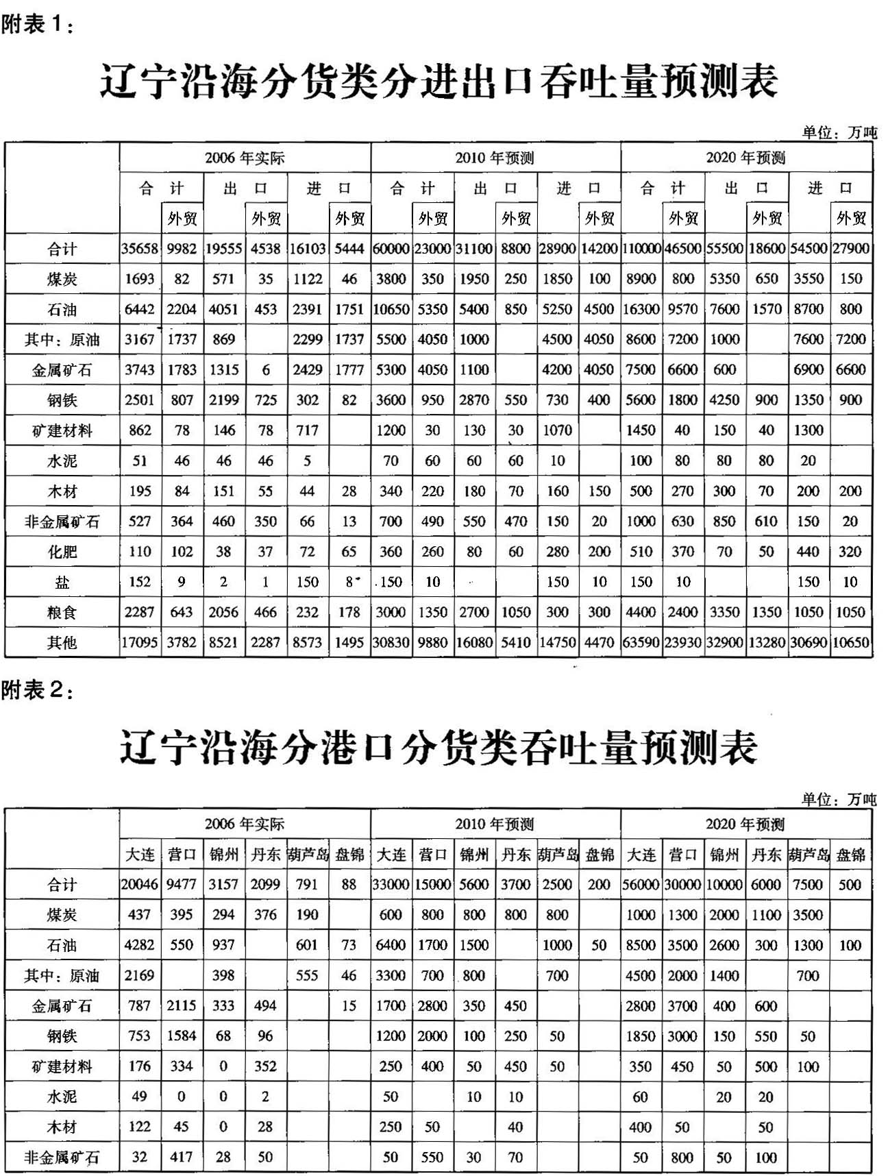 预计2010年和2020年大连港货物吞吐量将分别达到3.3亿吨和5.6亿吨左右;营口港将达到1.5亿吨和3.0亿吨左右;锦州港将达到5600万吨和1亿吨左右;丹东港将达到3700万吨和6000万吨左右;葫芦岛港将达到2500万吨和7500万吨左右;盘锦港将达到200万吨和500万吨左右。