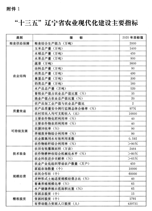 附件:1.“十三五”辽宁省农业现代化建设主要指标