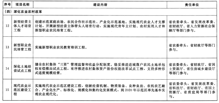 (一)创新强农工程。创新是农业现代化的第一动力,破解“三农”难题,必须坚持不懈推进体制机制创新,着力推进供给创新、科技创新和体制机制创新,着力强化物质装备和技术支撑,着力构建现代农业产业体系、生产体系、经营体系,加快实施藏粮于地、藏粮于技战略和创新驱动发展战略,培育更健康、更可持续的增长动力,激发亿万农民创新创业活力,释放农业农村发展新动能,根本转变高投入、高消耗、低产出的粗放式经营模式。