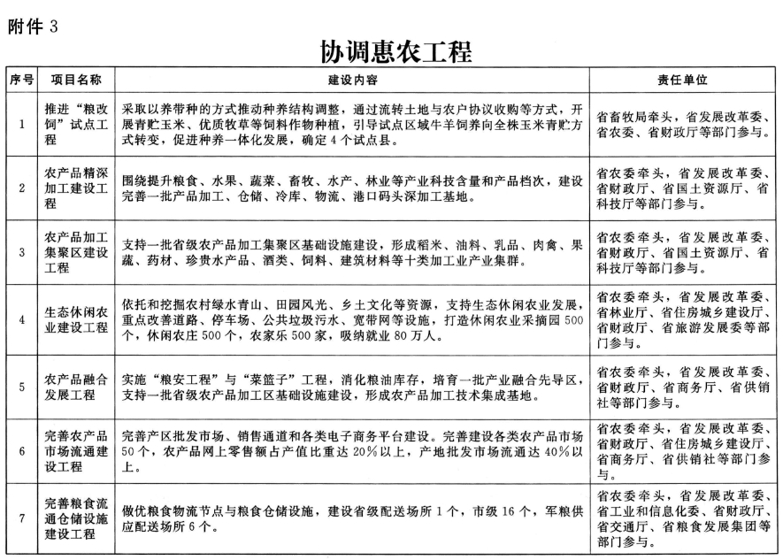 (二)协调惠农工程。协调是农业现代化的内在要求,必须树立全面统筹的系统观,着力推进产业融合、区域统筹、主体协同。充分发挥农村的独特优势,深度挖掘农业的多种功能,培育壮大农村新产业新业态,推动粮经饲统筹、农林牧渔结合、种养加一体、一二三产业融合发展,加快形成内部协调、与经济社会发展水平和资源环境承载力相适应的农业产业布局,促进农业现代化水平整体跃升。让农业成为充满希望的朝阳产业,让农村成为可以大有作为的广阔天地。