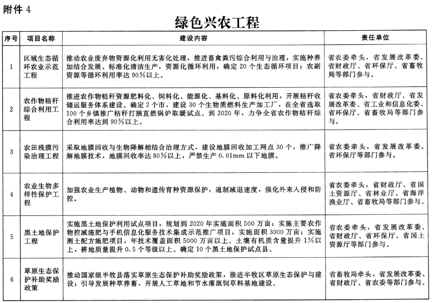 (三)绿色兴农工程。绿色是农业现代化的重要标志,必须牢固树立绿水青山就是金山银山的理念,着力推进绿色农业发展,加快补齐生态建设和农产品质量安全短板,推动农业可持续发展,实现资源利用高效、生态系统稳定、产地环境良好、产品质量安全的农业可持续发展新格局。