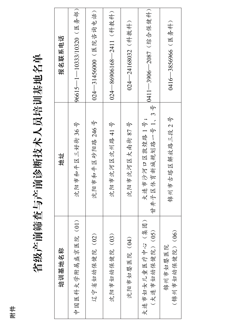 (一)规范省级培训基地管理。中国医科大学附属盛京医院等6所产前诊断机构作为省级产前筛查与产前诊断技术人员培训基地(名单见附件),承担拟从事产前诊断和产前筛查技术人员的培训工作。省级培训基地实行动态管理,根据培训工作质量和培训需求予以适当增减。