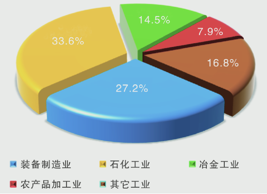 分行业看,全年规模以上装备制造业增加值比上年增长2.2%,占规模以上工业增加值的比重为27.2%。其中,计算机、通信和其他电子设备制造业增加值增长28.5%,铁路、船舶、航空航天和其他运输设备制造业增加值增长7.5%,专用设备制造业增加值增长6.8%,通用设备制造业增加值增长4.4%,汽车制造业增加值持平。全年石化工业增加值比上年下降3.5%,占规模以上工业增加值的比重为33.6%。其中,化学原料和化学制品制造业增加值增长10.3%,石油、煤炭及其他燃料加工业增加值下降10.9%。全年冶金工业增加值比上年下降6.8%,占规模以上工业增加值的比重为14.5%。其中,黑色金属矿采选业增加值下降4.6%,黑色金属冶炼和压延加工业增加值下降7.4%。全年农产品加工业增加值比上年下降2.3%,占规模以上工业增加值的比重为7.9%。其中,烟草制品业增加值增长10.6%,农副食品加工业增加值下降0.1%,食品制造业增加值下降4.3%。