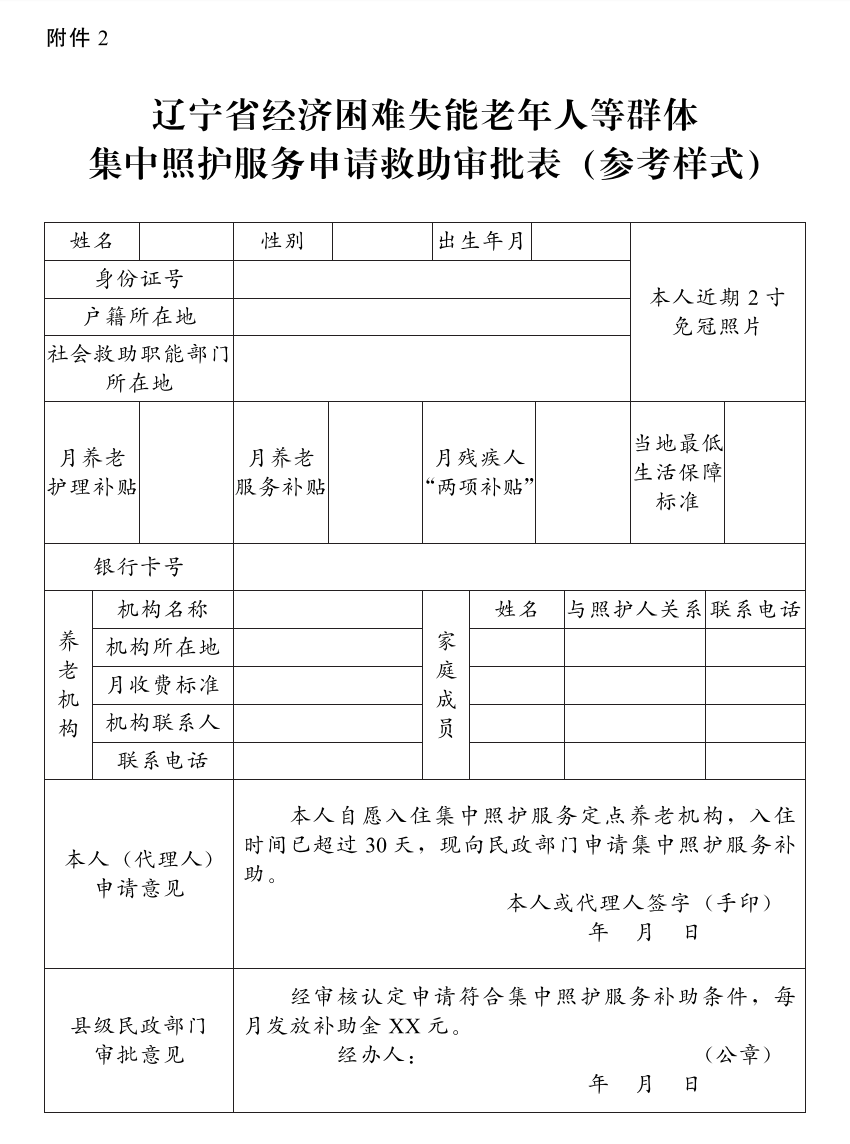 2.辽宁省经济困难失能老年人等群体集中照护服务申请救助审批表(参考样式)