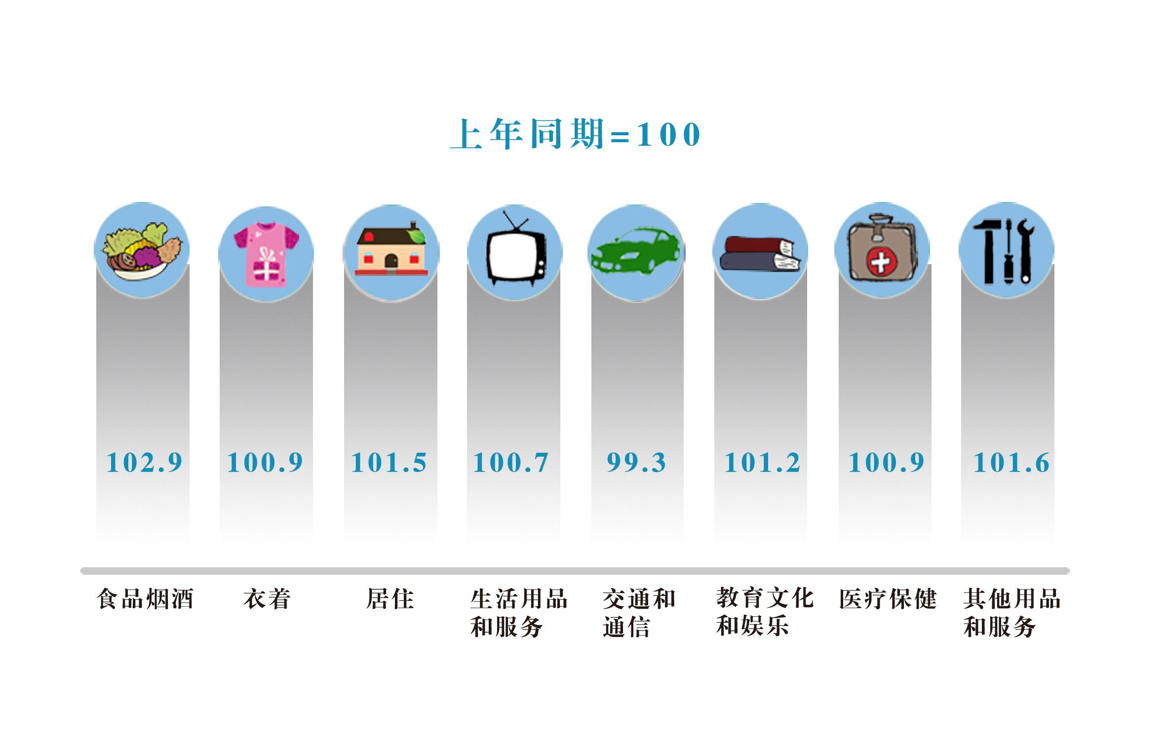 全年居民消费价格指数(CPI)比上年上涨1.5%。八大类商品呈“七涨一降”态势。分类别看,食品烟酒类价格上涨幅度最大,比上年上涨2.9%;其他用品和服务类上涨居第二位,上涨1.6%;居住类、教育文化和娱乐类、衣着类、医疗保健类、生活用品及服务类分别上涨1.5%、1.2%、0.9%、0.9%和0.7%;唯一下降的类别为交通和通讯类,下降0.7%。