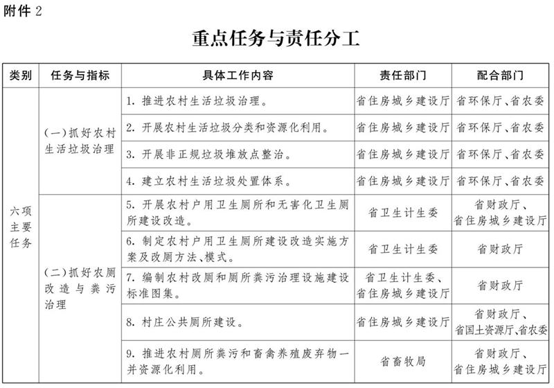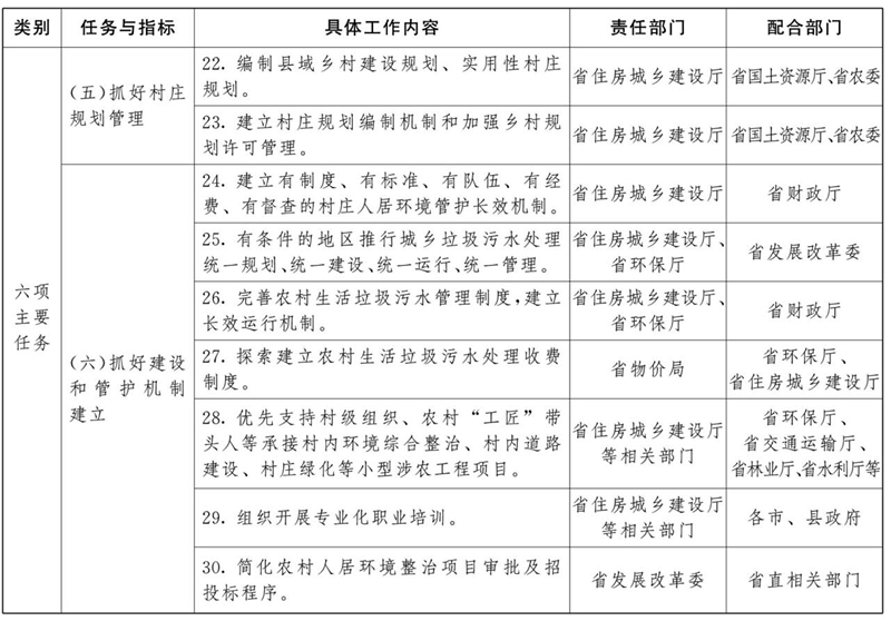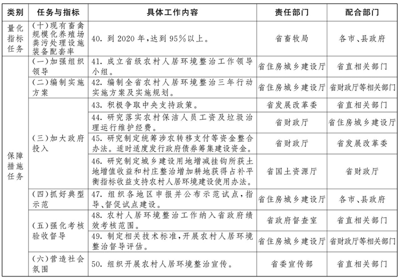 (一)加强组织领导。省、市、县(市、涉农区)要分别成立由政府主要领导同志任组长的农村人居环境整治工作领导小组,领导小组办公室设在住房城乡建设部门。县级党委和政府是县域农村人居环境整治责任主体,负责做好细化分工、落实责任以及项目落地、资金使用等工作,要明确具体工作措施、时间表、路线图。市级党委和政府是市域农村人居环境整治责任主体,负责上下衔接、辖区内协调和督促检查等工作,乡镇党委和政府是乡镇域内农村人居环境整治实施主体,负责具体组织实施,村庄要有专人负责。省住房城乡建设厅牵头负责农村人居环境整治的指导、组织、监督等日常工作,具体抓好乡村规划编制和农村生活垃圾治理;省发展改革委负责争取国家支持政策,规范和简化建设项目审批程序;省财政厅负责农村人居环境整治相关资金筹集、下达及美丽乡村建设;省环保厅负责农村污水治理和黑臭水体整治以及工业固体废弃物垃圾治理;省交通运输厅负责农村道路建设;省农委负责农作物秸秆综合利用、农业生产垃圾治理;省水利厅负责村内河道及房前屋后河塘沟渠整治,实施清淤疏浚;省林业厅负责村庄绿化;省卫生计生委负责农村卫生厕所和无害化卫生厕所建设改造,推进农村“厕所革命”;省畜牧局负责畜禽粪污治理。其他各级相关部门按照职责分工,各司其职,密切配合,形成合力,共同推进,提供有力组织和政策保障。