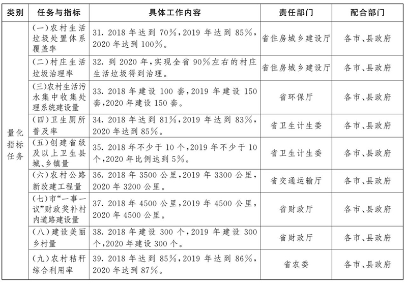 2018年,全面启动,有序开展。完成农村人居环境整治三年行动实施方案编制,城市近郊区和经济较发达的村庄规划管理基本覆盖,农村生活垃圾处置体系覆盖70%行政村,新建生活污水集中收集处理系统100套,农村卫生厕所普及率达到81%,创建省级及以上卫生县城(乡镇)不少于10个,农村公路新改建工程3500公里,“一事一议”财政奖补村内道路建设4500公里,农作物秸秆综合利用率达到85%,建设300个美丽乡村,实现村容村貌明显改观。