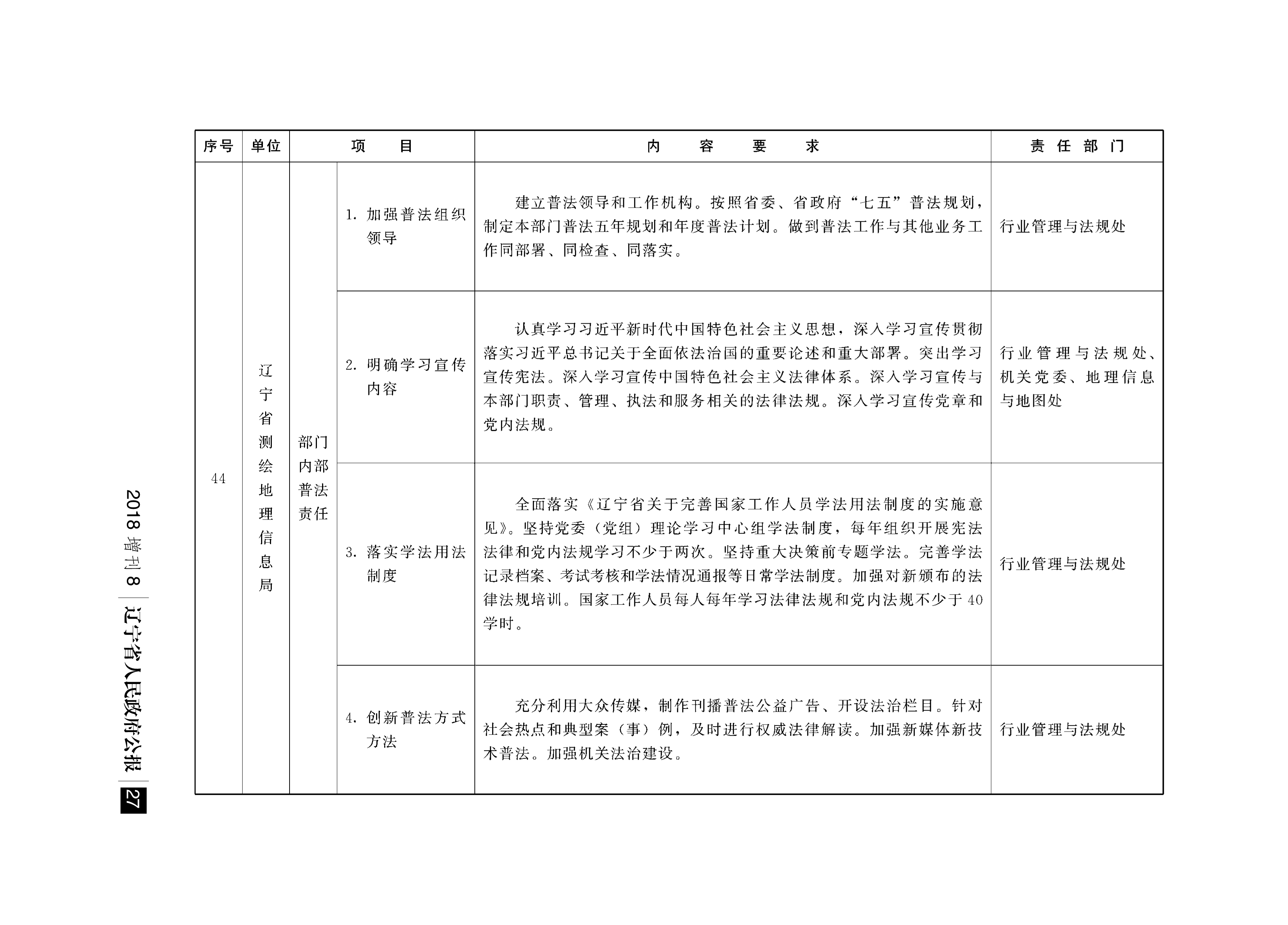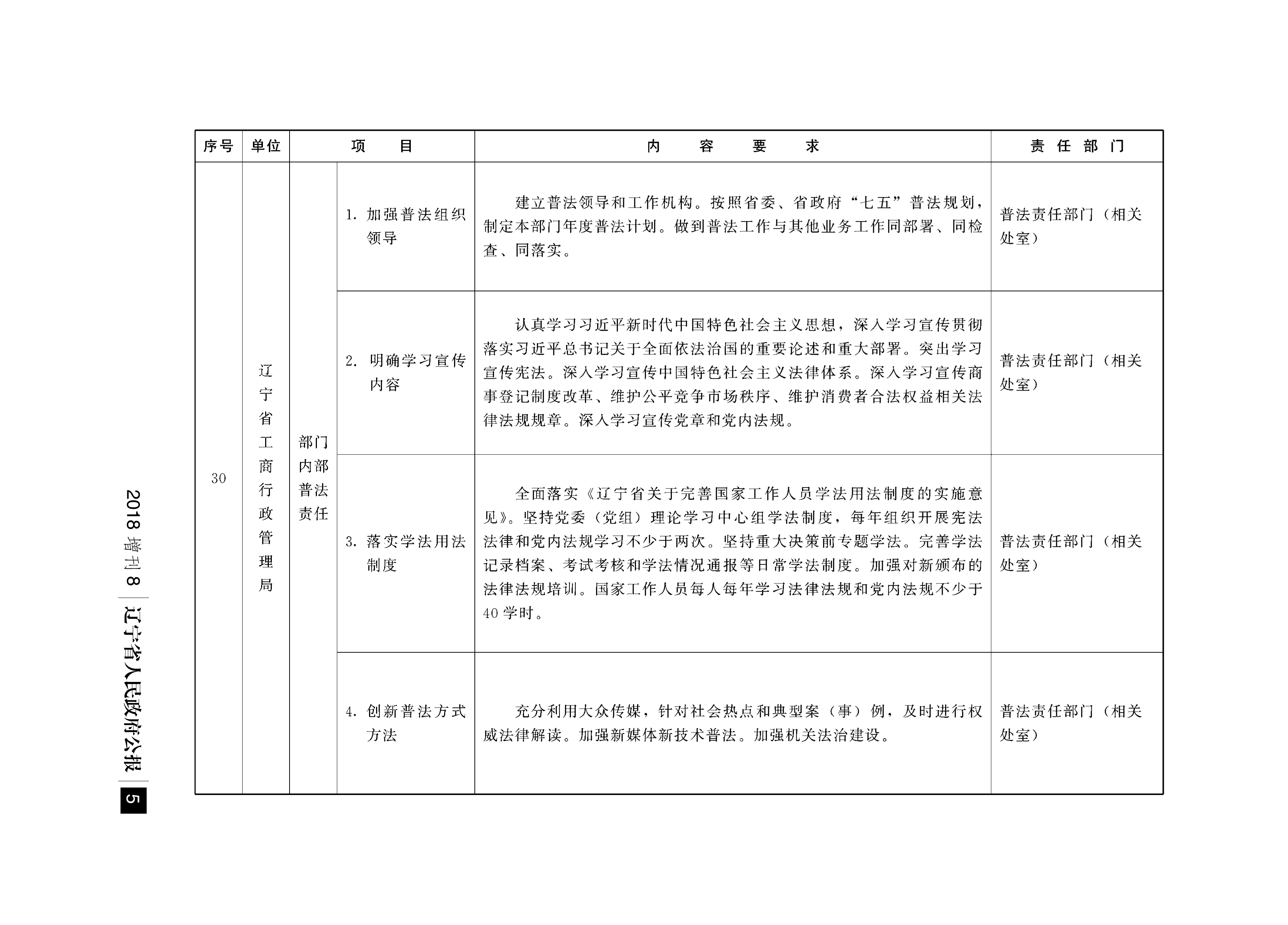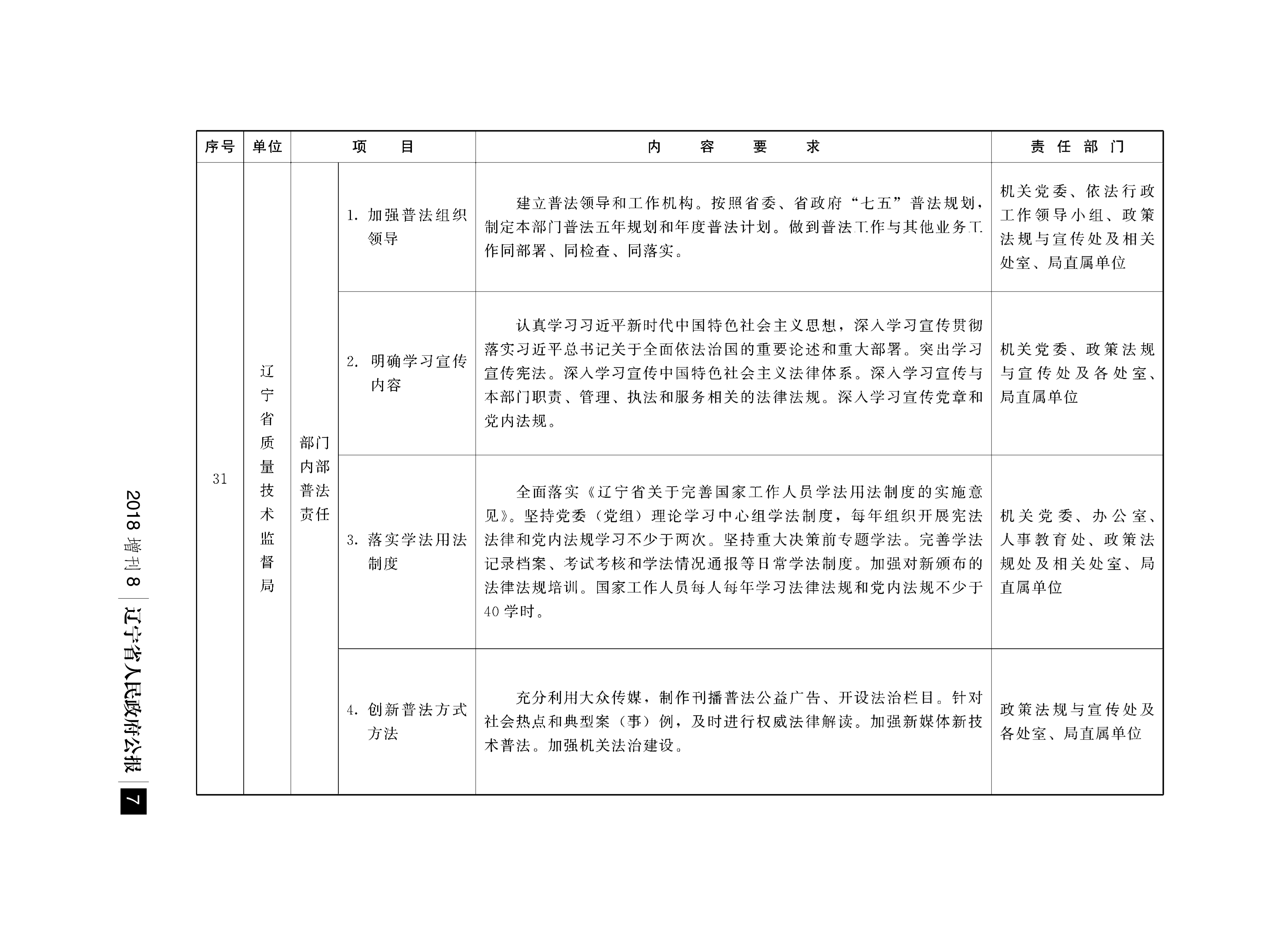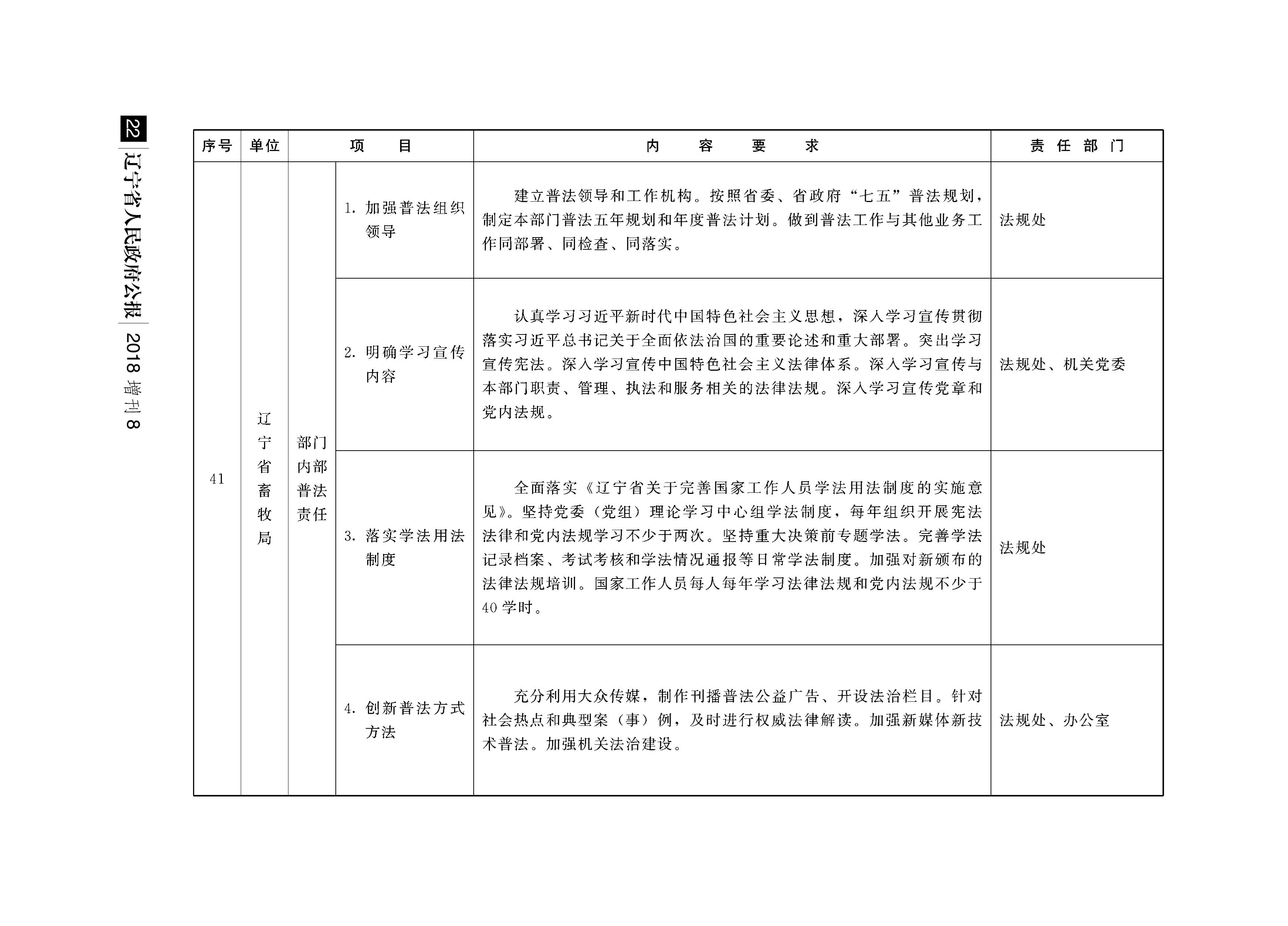 建立普法责任清单制度,是贯彻落实国家机关“谁执法谁普法”普法责任制的重要举措。普法责任清单明确了国家机关应当承普法工作责任,是开展普法工作的重要遵循。国家机关要把普法作为法治辽宁、平安辽宁建设的基础性工作,切实纳入本部门本单位工作总体安排,做到与其他业务工作同部署、同检查、同落实,努力在全社会形成尊法学法守法用法的浓厚氛围。按照普法责任制要求,建立健全普法领导和工作机构,明确普法任务和工作要求,制定普法中长期规划和年度普法计划,明确责任部门、责任人员和时限,并根据相关法律法规、规范性文件的调整,及时进行补充完善。