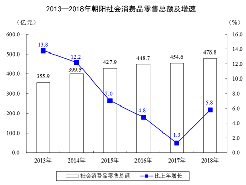 全年社会消费品零售总额478.8亿元,比上年增长5.8%。从不同地域看:城镇消费品零售额430.3亿元,增长5.5%;乡村消费品零售额48.5亿元,增长8.1%。从消费形态看:批发零售业零售额431.9亿元,增长5.6%,其中限额以上零售额70.2亿元,下降0.7%;住宿餐饮业零售额46.9亿元,增长7.0%,其中限额以上零售额2.5亿元,增长4.3%。