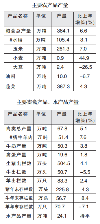 全市农作物播种面积64.7万公顷,其中粮食作物播种面积51.5万公顷。粮食生产实现十四连丰,粮食总产量384.1万吨,其中水稻产量105.4万吨,玉米产量261.3万吨。水果产量30.8万吨;蔬菜产量387.3万吨;肉类总产量67.8万吨;禽蛋产量19.6万吨;牛奶产量50.3万吨。