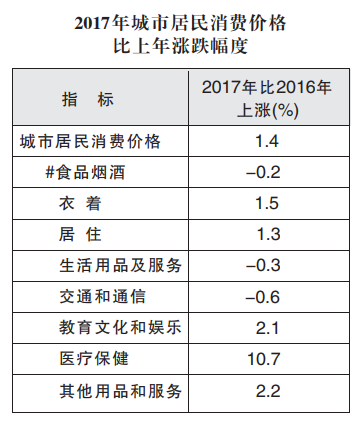 全年城市居民消费价格比上年上涨1.4%。其中,服务价格上涨2.1%,消费品价格上涨1.0%;食品烟酒价格下降0.2%。工业生产者出厂价格上涨1.7%,工业生产者购进价格上涨12.8%,全市新建商品住宅价格上涨8.4%。