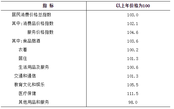 全年居民消费价格比上年上涨3.0%,其中消费品价格上涨2.1%,服务价格上涨4.6%。工业生产者出厂价格比上年上涨3.2%。工业生产者购进价格比上年上涨7.7%。