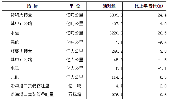 全年各种运输方式客货换算周转量6900亿吨公里,比上年下降24.1%。货物周转量6809.9亿吨公里,下降24.4%;旅客周转量240.2亿人公里,增长3.0%。