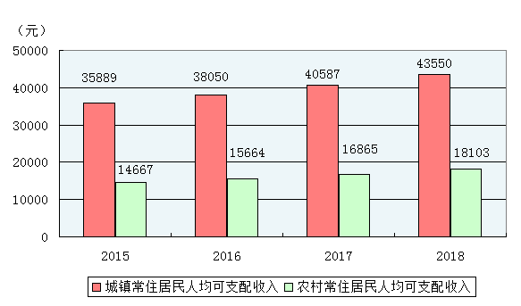 全年城镇常住居民年人均可支配收入43550元,比上年增长7.3%;年人均消费支出29928元,增长10.1%。农村常住居民年人均可支配收入18103元,比上年增长7.3%;年人均消费支出11226元,增长8.3%。