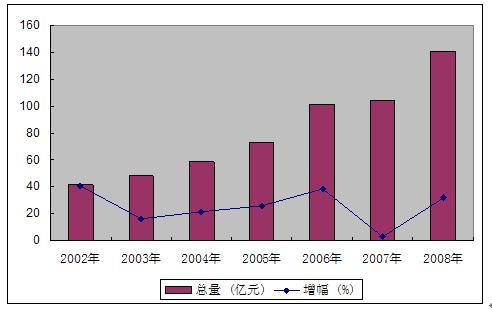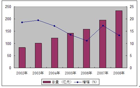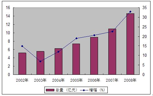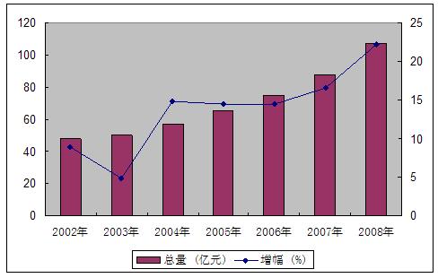 图4 2002-2008年社会消费品零售总额及其增长速度