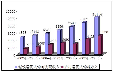 图6 2002-2008年城市居民人均可支配收入和农村人均纯收入
