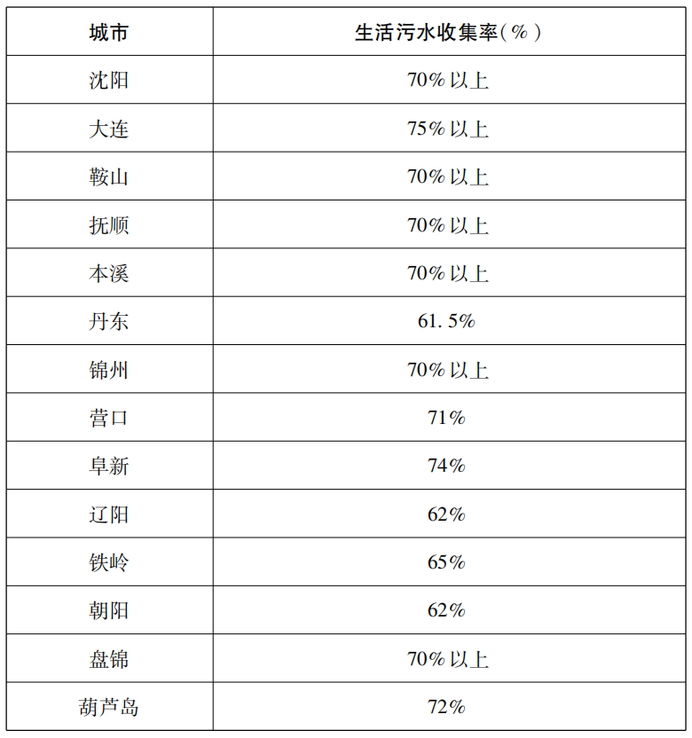 到2021年底前,地级以上城市生活污水集中收集率达到70%以上,县级市城市生活污水集中收集率不低于50%。到2021年前,地级以上城市建成区基本实现无生活污水直排口,基本消除城中村、老旧城区和城乡结合部生活污水收集处理设施空白区,基本消除黑臭水体。城市生活污水集中收集效能显著提高,地级以上城市污水处理厂进水生化需氧量(BOD)浓度均不低于100mg/L;沈阳、大连、鞍山、抚顺、本溪、锦州、营口、阜新、盘锦、葫芦岛等市城市生活污水集中收集率达到70%以上;丹东、辽阳、铁岭、朝阳市生活污水集中收集率不低于60%,县级市城市生活污水集中收集率不低于50%。(生活污水收集率计算说明及各市生活污水集中收集率目标详见附件1、2)