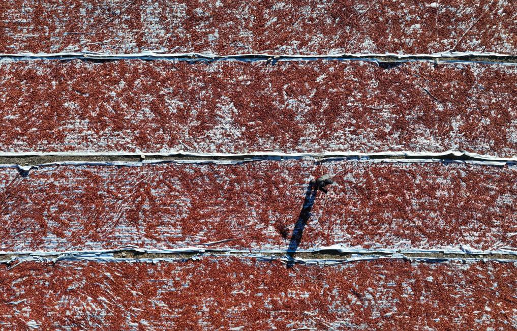 河北省遵化市侯家寨镇的农民在晾晒用于中药材的山楂片(2023年11月14日摄,无人机照片)。