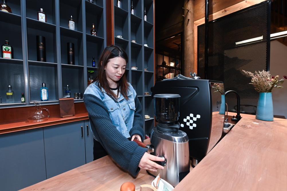 在浙江省杭州市临安区清凉峰镇白果村一家民宿里,“95”后民宿主人章宁悦在煮咖啡(2023年3月17日摄)。 新华社记者 徐昱 摄
