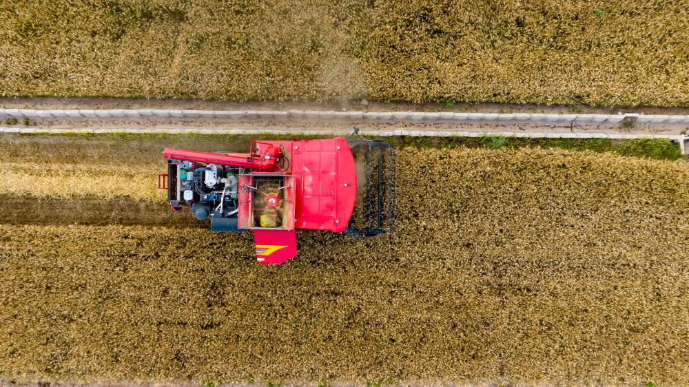 收割机在宁夏吴忠市同心县王团镇蔡家滩村麦田收获小麦(无人机照片,2024年7月10日摄)。新华社记者 杨植森 摄