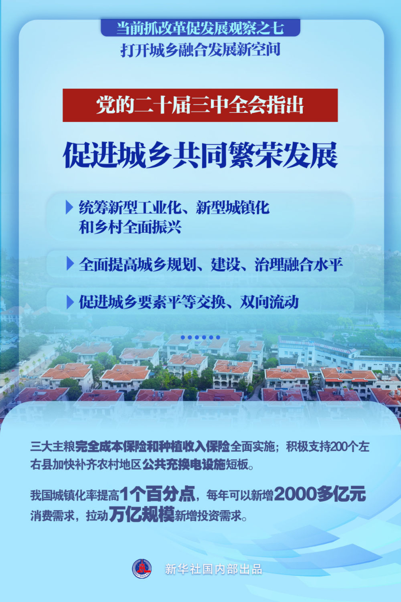党的二十届三中全会审议通过的《中共中央关于进一步全面深化改革、推进中国式现代化的决定》,强调“必须统筹新型工业化、新型城镇化和乡村全面振兴,全面提高城乡规划、建设、治理融合水平,促进城乡要素平等交换、双向流动,缩小城乡差别,促进城乡共同繁荣发展”。